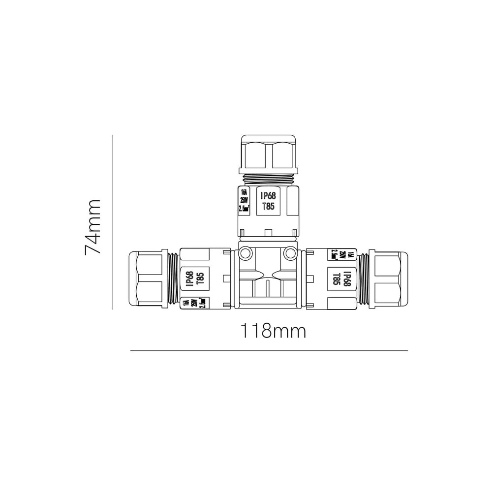 Conector en T IP68 negro de 74x118 mm con 3 salidas, hasta 16A y 240V