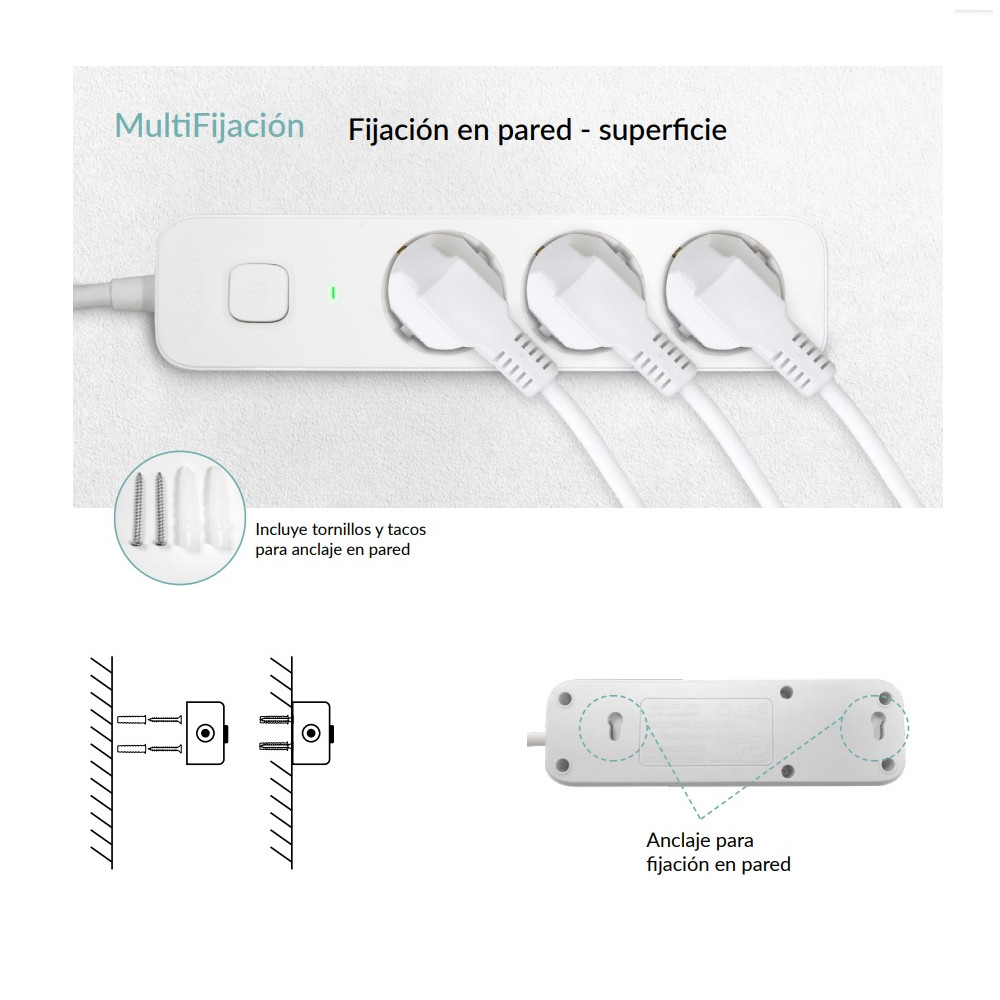 Regleta de conexión clase I con interruptor ON/OFF de diseño minimalista y LED indicador. Clavija shuko con una capacidad máxima de 3680W. Ideales para el uso con equipos eléctricos. Cable 3x1.5 mm2. Con protección para niños y opción de anclaje para fijación en la pared.