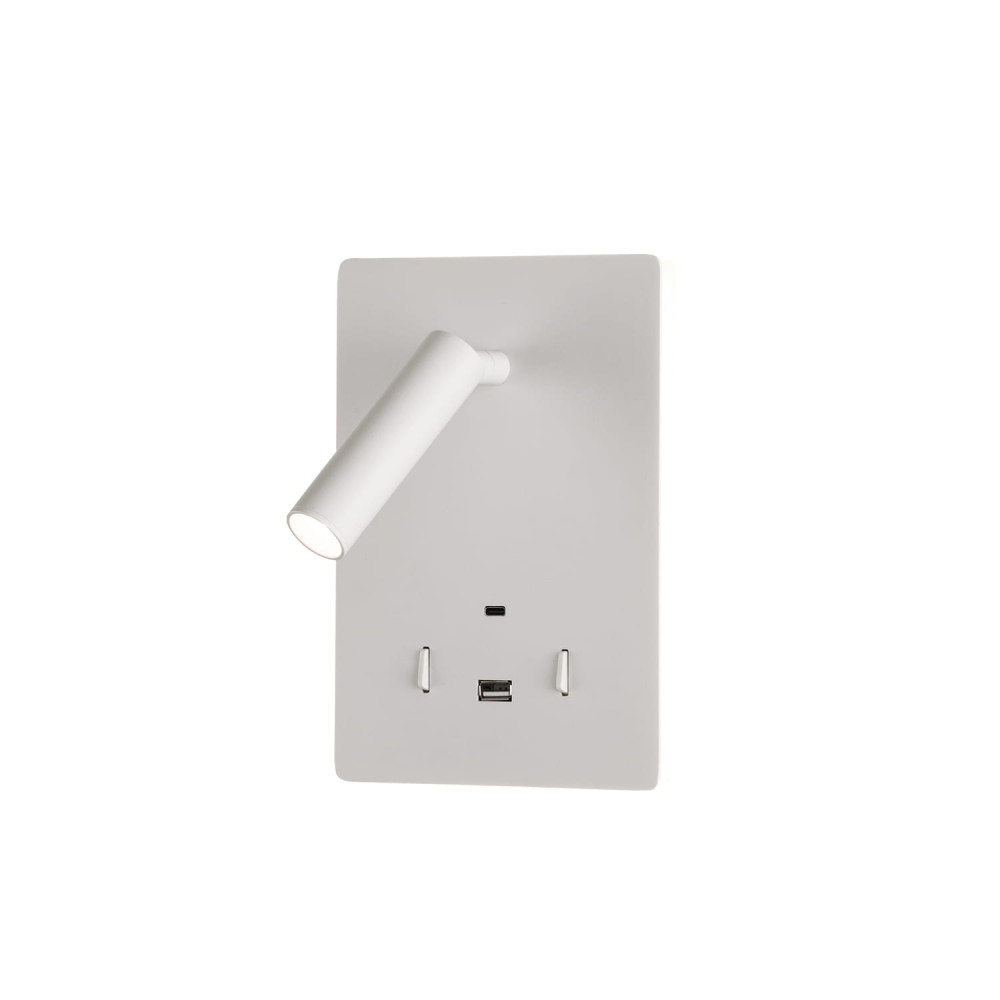 Manat es un aplique lector acabado en blanco texturado, luz led indirecta 12W 3000K 970lm + lector led 3W 3000K 315lm, dos interruptores, orientable y carga USB-A y USB-C.