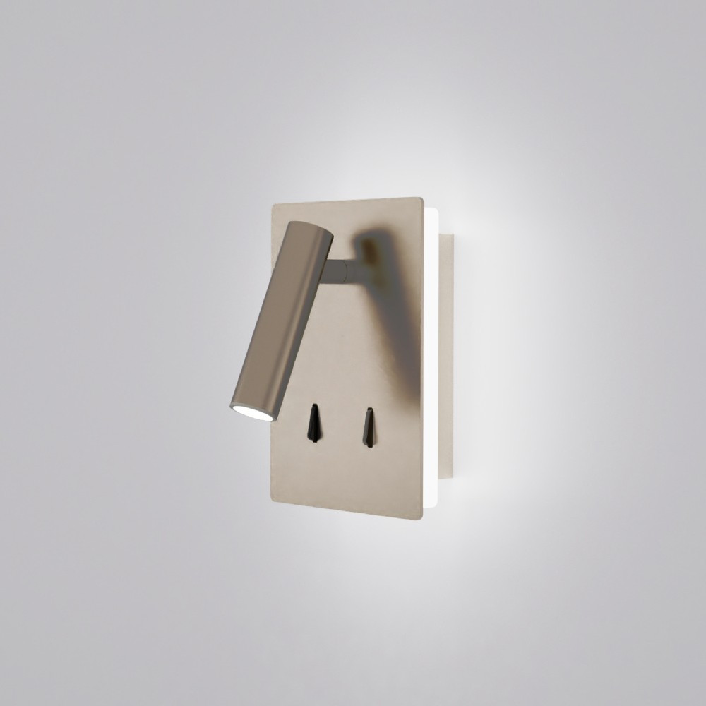 Manat es un aplique lector acabado en níquel, luz led indirecta, LED 4W 3000K 330lm + 3W 3000K 285lm, CRI90 CL.I, Dos interruptores, Orientable