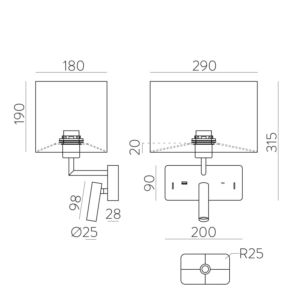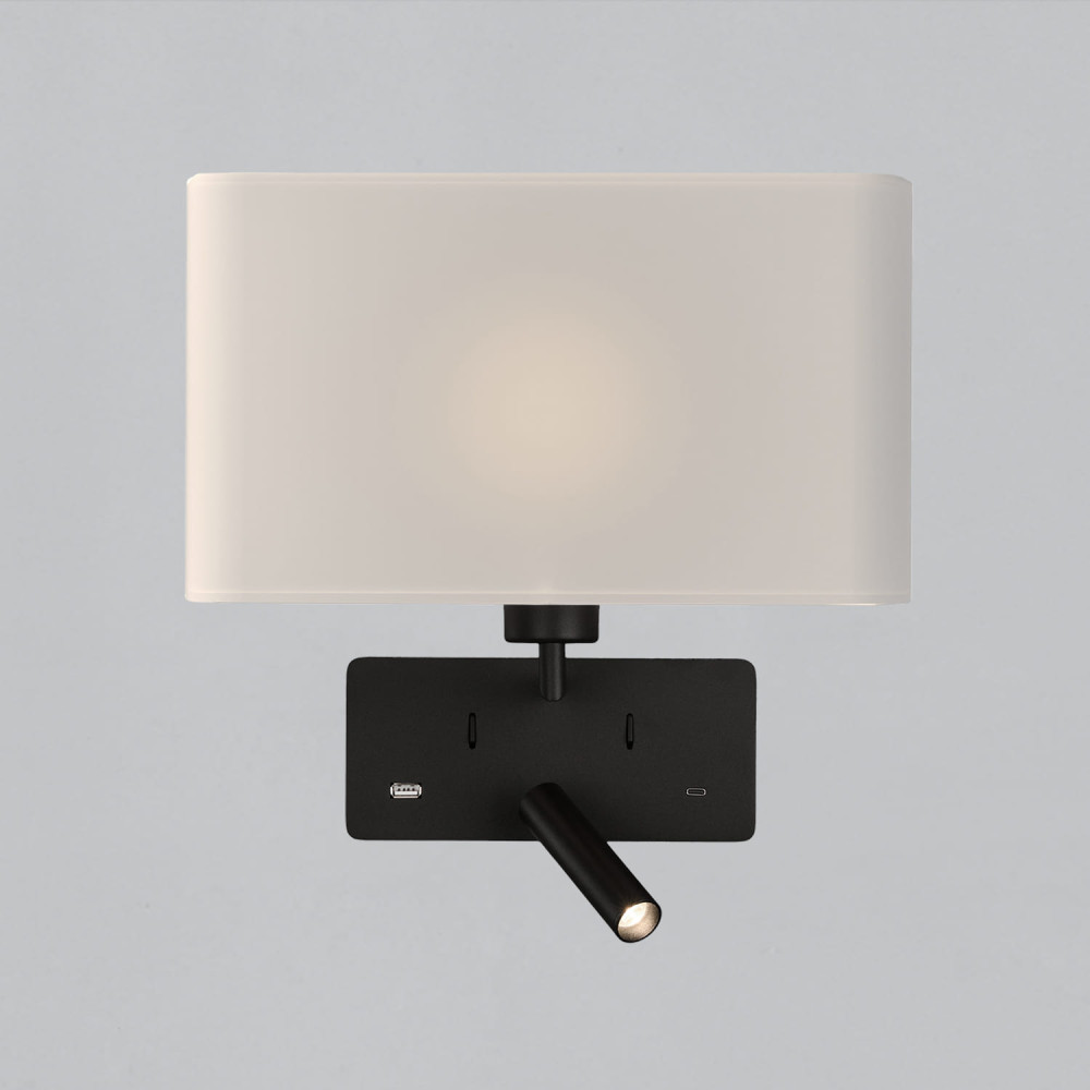 ROMEO es un aplique lector negro de pared rectangular fabricado en aluminio con pantalla de algodón blanca, incluida.