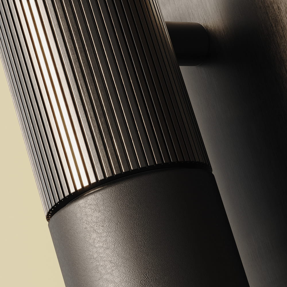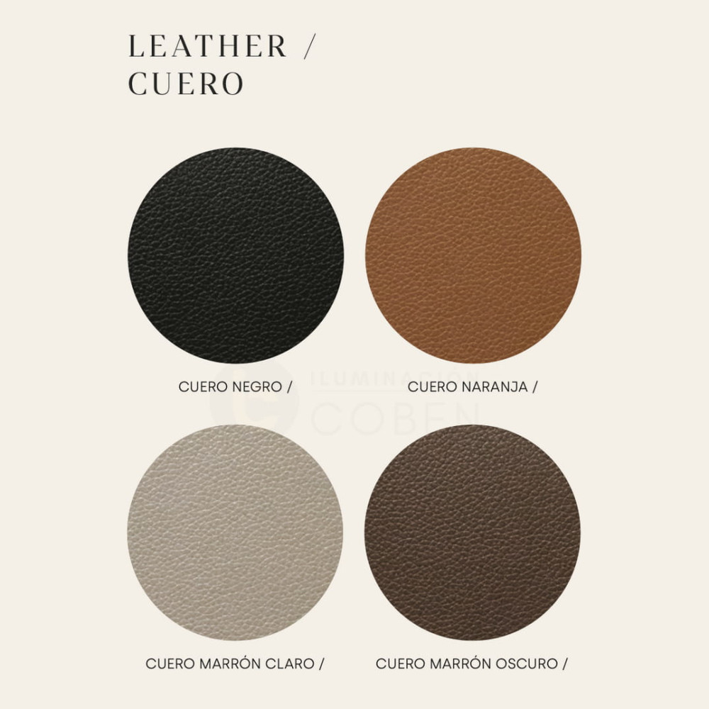 Las luminarias presentan una estructura metálica disponible en negro u oro envejecido, acabados que aportan elegancia y versatilidad a cualquier interior. El detalle más característico de la colección se encuentra en sus cabezales revestidos en cuero, un material cálido y atemporal que eleva el diseño y aporta textura. Los cabezales están disponibles en cuatro acabados de cuero: marrón claro, marrón oscuro, negro y naranja, permitiendo personalizar la pieza según el estilo del espacio.