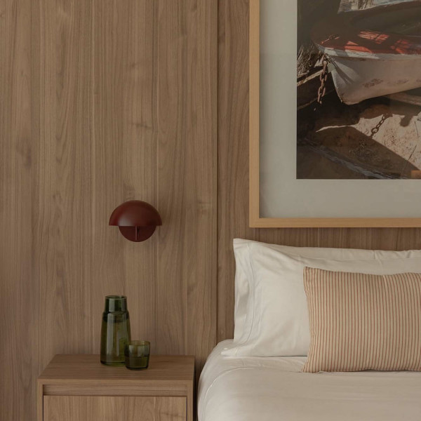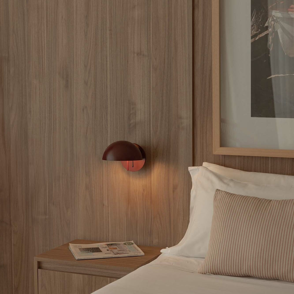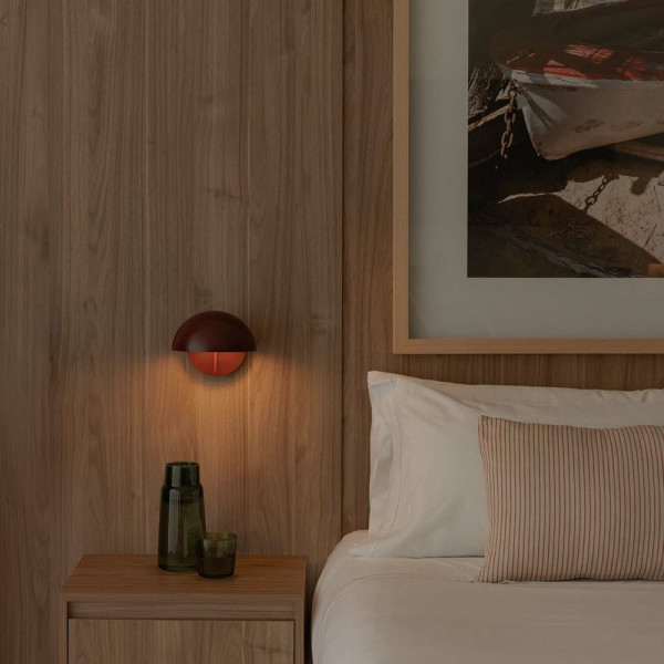 La familia MATILDA, diseñada por Faro Lab, hace gala de un minimalismo geométrico que le permite integrarse en cualquier espacio. Su sistema de pantalla giratoria y su regulación en altura ofrece gran variedad de efectos de luz, convirtiéndola en una colección multifuncional. El aplique en color granate se caracteriza por sus formas puras y geométricas.