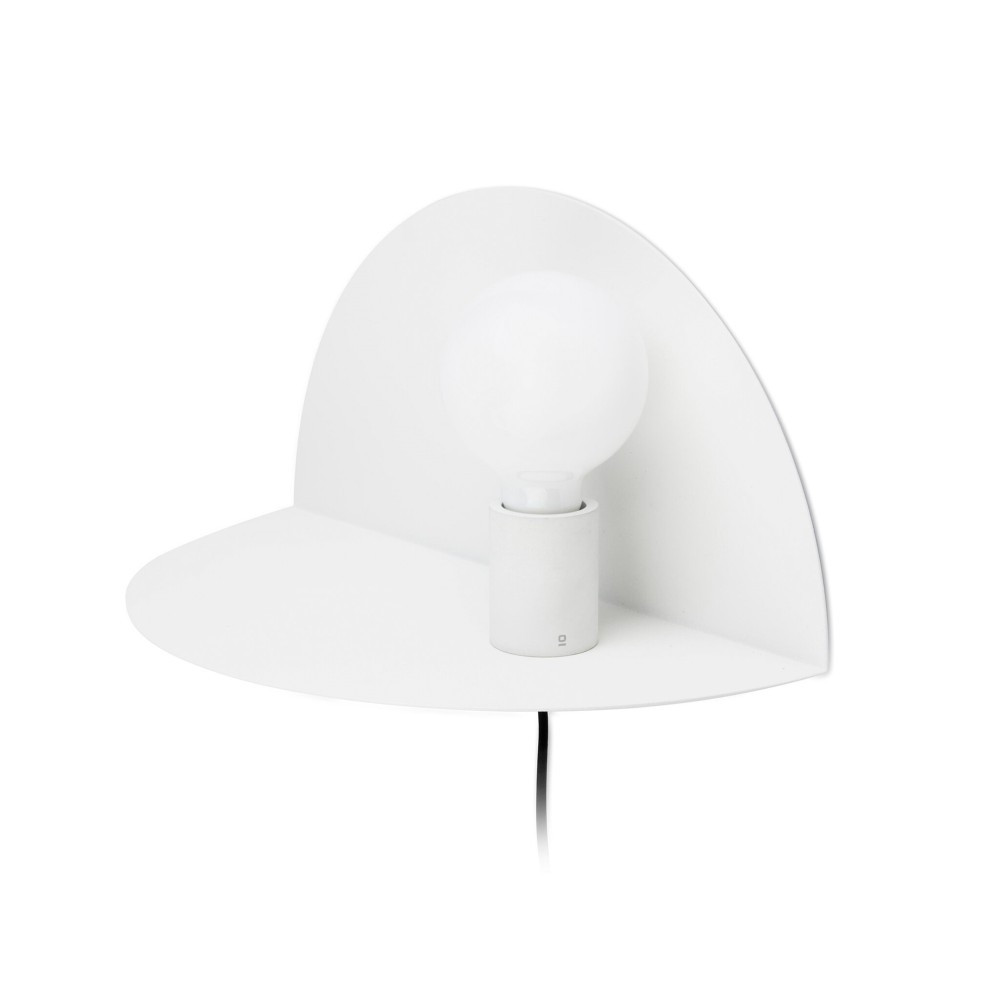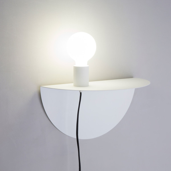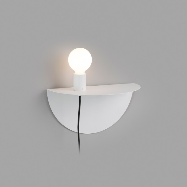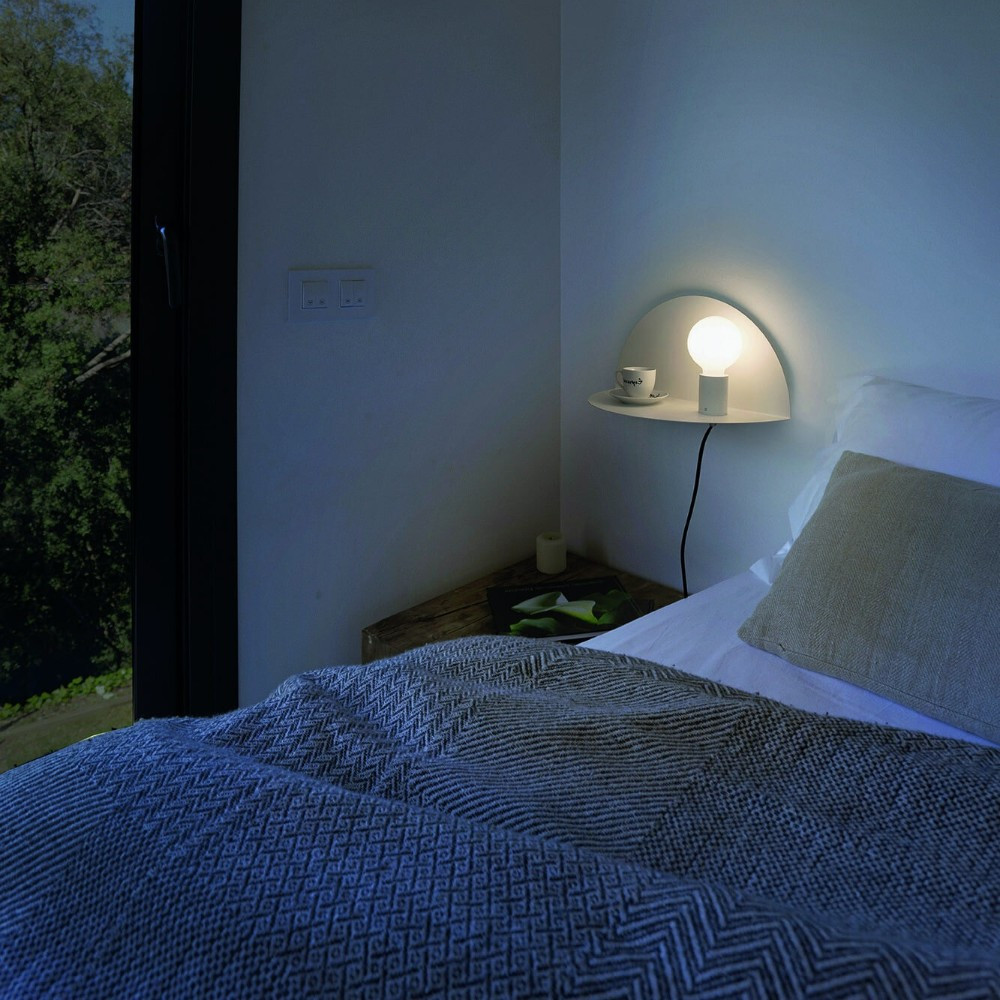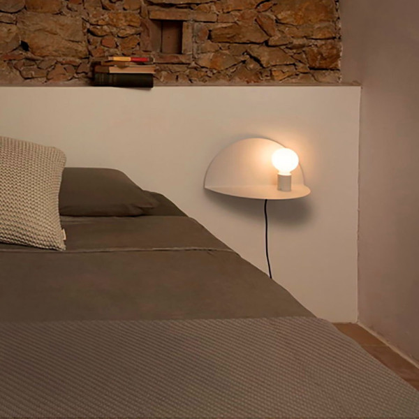 NIT es un aplique de diseño blanco creado por Goula Figuera. Su estructura está formada por un círculo doblado. Un lado permite fijarlo a la pared, mientras que el otro lado se puede utilizar como estante. El portalámparas hace que el dormitorio se sienta más acogedor, hogareño y cálido. El haz de luz se encuentra a la derecha.