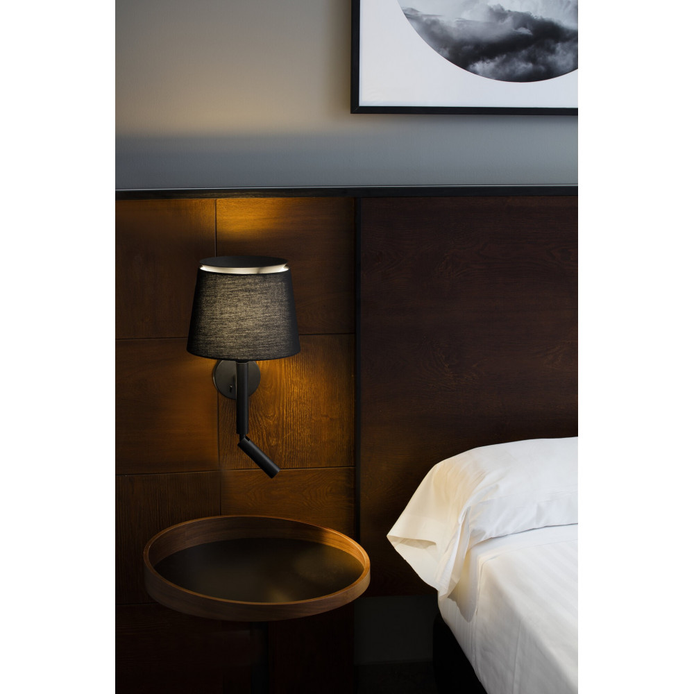 SAVOY es una lámpara aplique negra con la pantalla textil negra para la iluminación interior diseñada por Isaac Piñeiro. Su estructura se caracteriza por el aro situado en la parte superior por donde se refleja la luz creando un bonito reflejo.