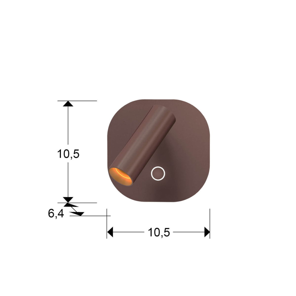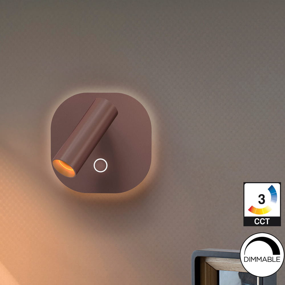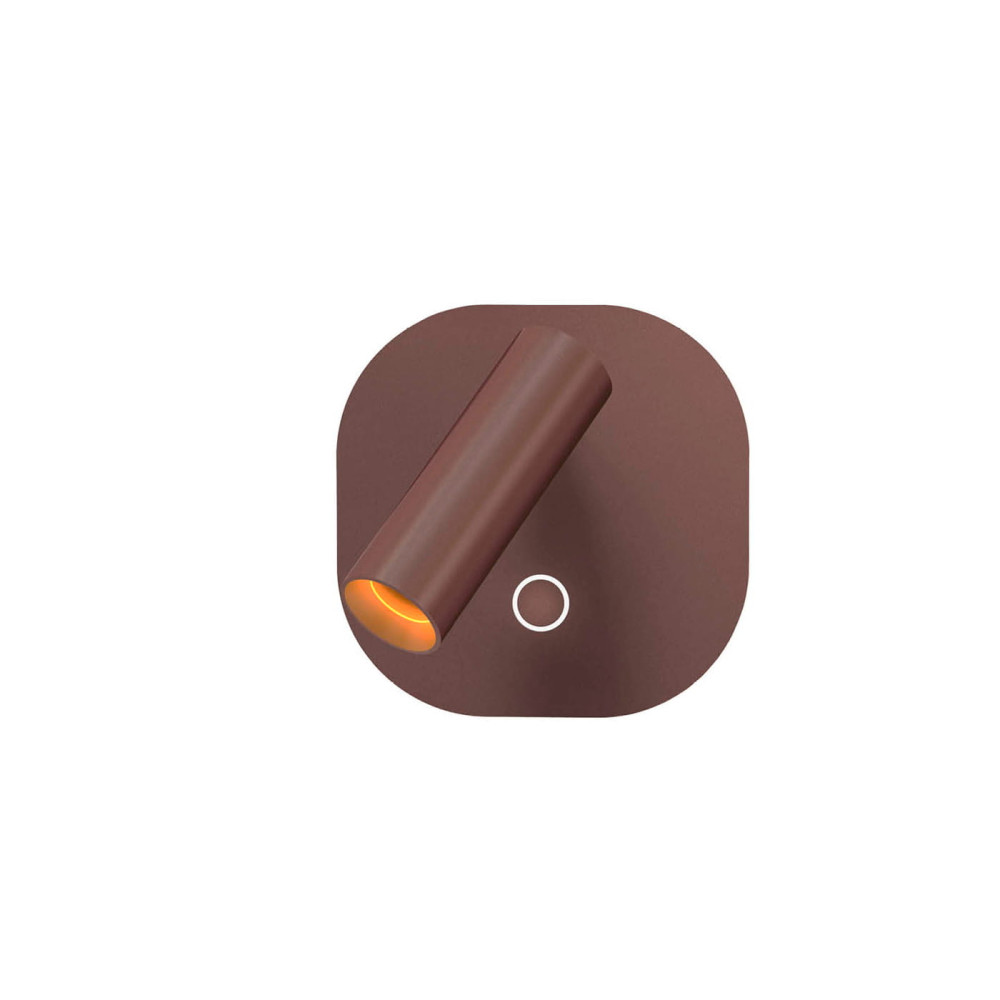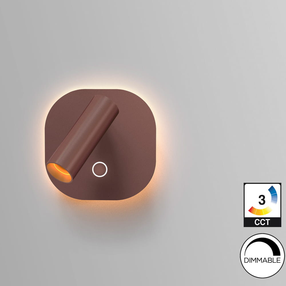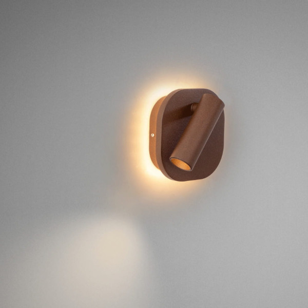 Lámpara de pared en aluminio, acabado marrón óxido. Iluminación: Foco de lectura 2,1W y retroiluminación de 6W, ambos LED CCT y regulación independiente de tono de luz e intensidad por pulsador táctil. LED 8,1W, CCT: 2700-4000 K. 167+391 lm. DIMABLE