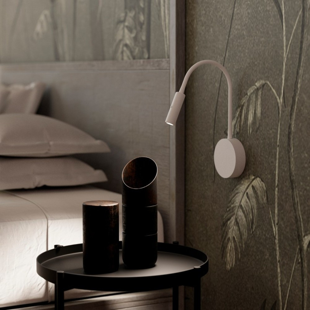 Aplique de aluminio con brazo flexible de silicona con LED integrado y base cilíndrica metálica que incluye interruptor. Sus líneas sencillas y su acabado negro arenado le confieren un aire minimalista y elegante. Foco muy eficaz e ideal como punto de luz para cabeceros o para situarlos cerca de un sillón de lectura. Cuenta con tornillos Allen en la base para que visualmente sea más estético. Se trata de una pieza muy versátil que complementará cualquier estancia haciéndola más funcional y ocupando el mínimo espacio.
