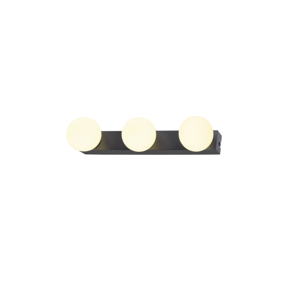 Aplique de baño LED IP44 negro con 3 esferas de cristal, botón táctil CCT. 13W, 3CCT, CRI90, 900/950/1000 lm