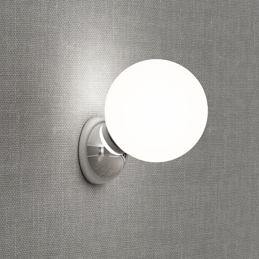 Aplique bola de baño fabricado en metal con esfera de vidrio opal.