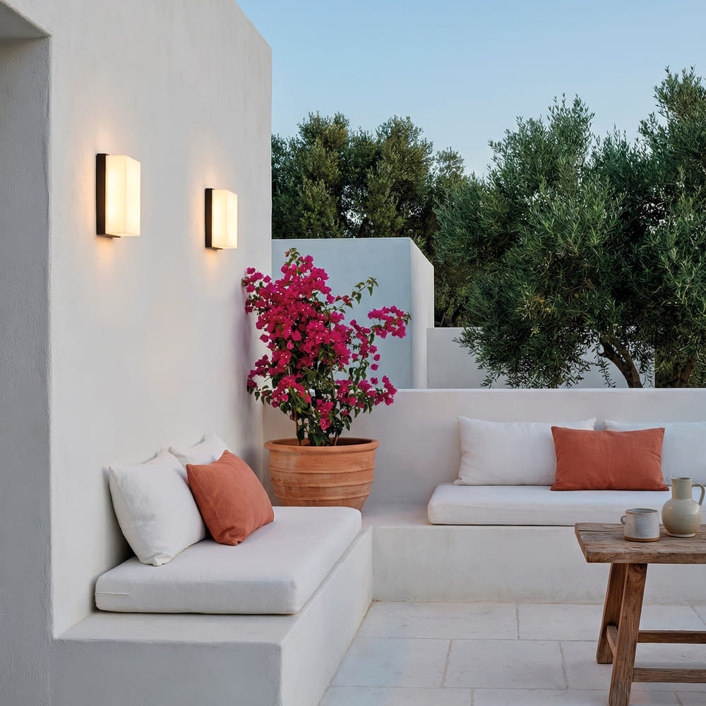 Con una forma rectangular limpia y sobria, Noel consta de una base en aluminio acabado Antracita Texturado y un difusor de PC blanco que abraza el cuerpo de luz. Como se aprecia en la imagen de ambiente, este aplique es ideal para espacios de inspiración mediterránea, contrastando elegantemente con paredes blancas de cal o piedra y complementando áreas de relax con vegetación. Su luz difusa es perfecta para señalizar caminos o iluminar zonas de descanso sin deslumbrar.