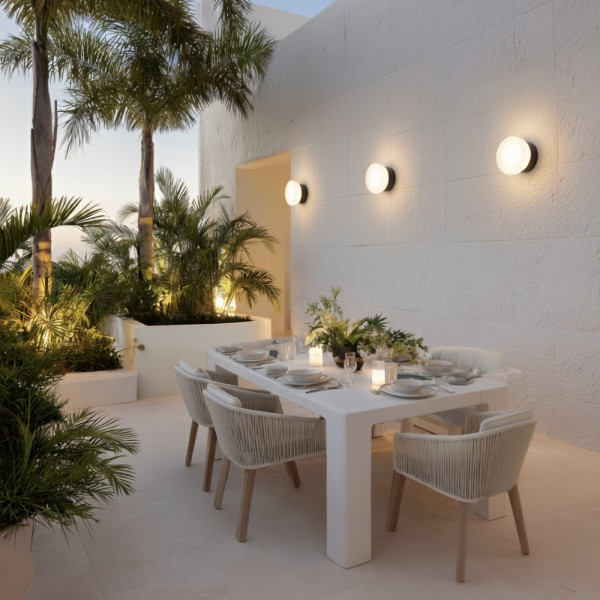Trap es un aplique para iluminación exterior. Fabricado en aluminio acabado negro texturado y cristal. IP65, apto para instalación en exteriores.