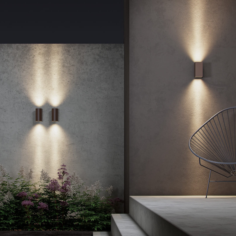 Sunset es un aplique LED exterior de 16W de potencia con doble emisión de luz, ideal para jardines, fachadas, y zonas al aire libre. Disponible en dos tipos de diseño - redondo o cuadrado - y tres acabados: blanco, negro o corten.