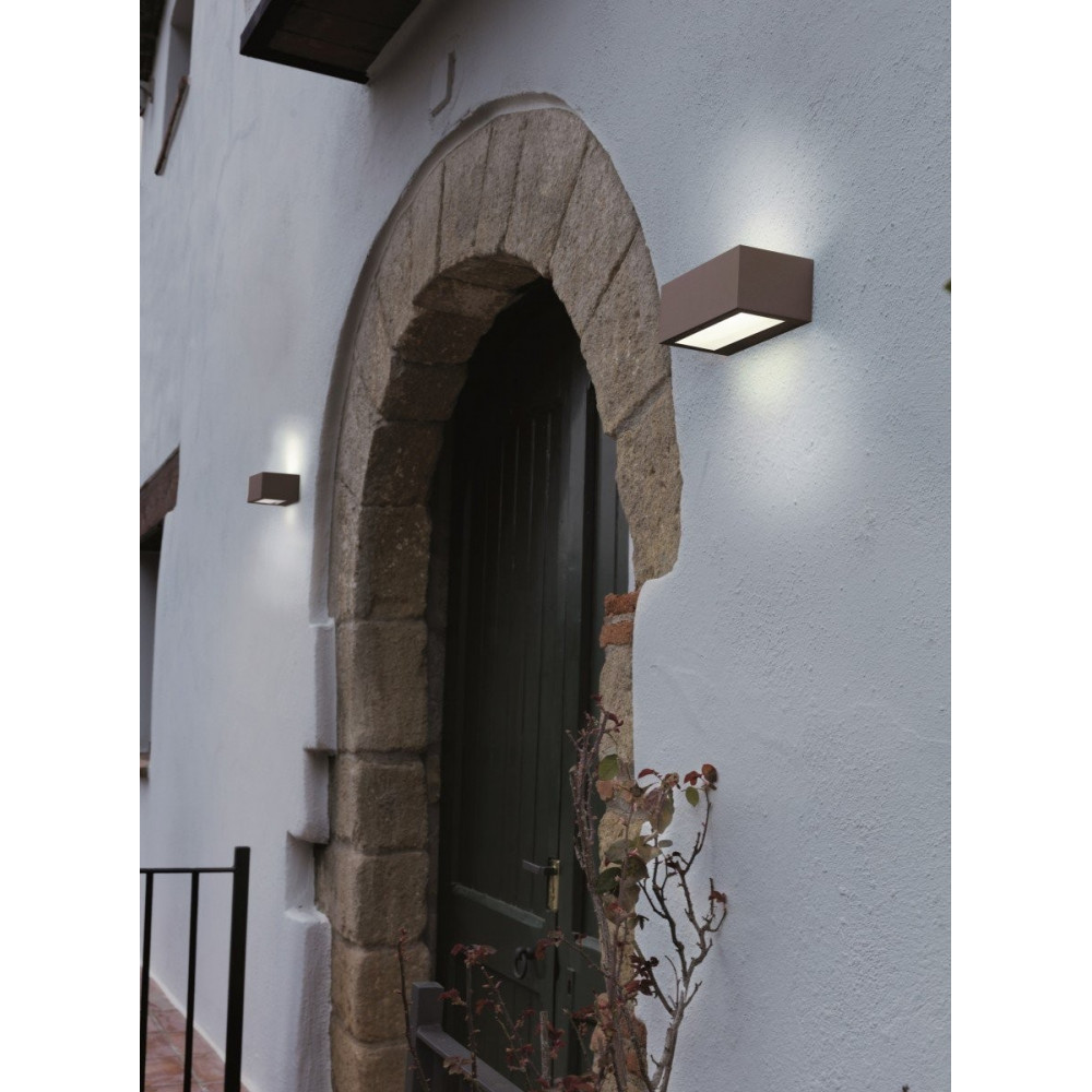 Lámpara aplique modelo ISORA. Cuerpo fabricado en aluminio y difusor de cristal matizado. Acabado en negro. Grado de protección IP65 y aislamiento de clase I. Luminaria con tecnología LED. Emisión de luz hacia arriba y hacia abajo.