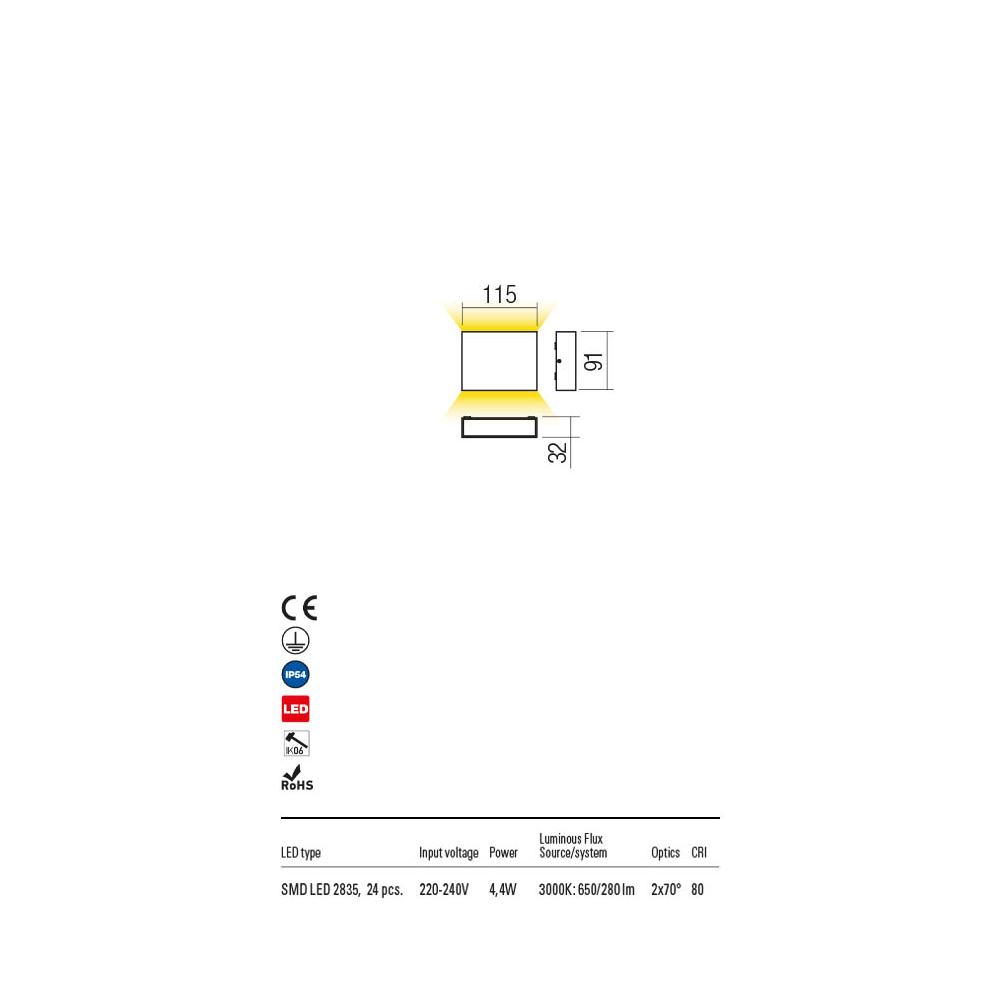 Apliques para exterior equipados con LEDs SMD, dispersión de luz indirecta. Cuerpo de aluminio fundido a presión pintado electrostáticamente en blanco arena, gris oscuro o marrón oscuro. Difusores de vidrio templado transparente.