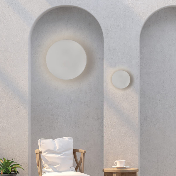 Colección de apliques para exteriores de luz indirecta, disponibles en tres acabados: negro, blanco u oro y cuatro diámetros: 20cm, 30cm, 45cm y 60cm.