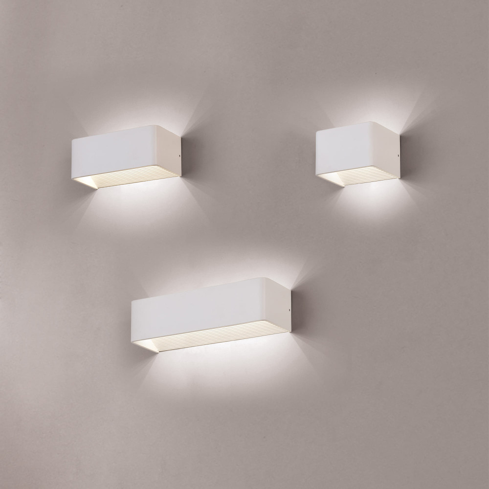 Aplique de pared LED con doble salida de luz, ideal para bañar paredes en estancias interiores. Fabricado en metal y disponible en tres acabados: blanco, negro y oro.