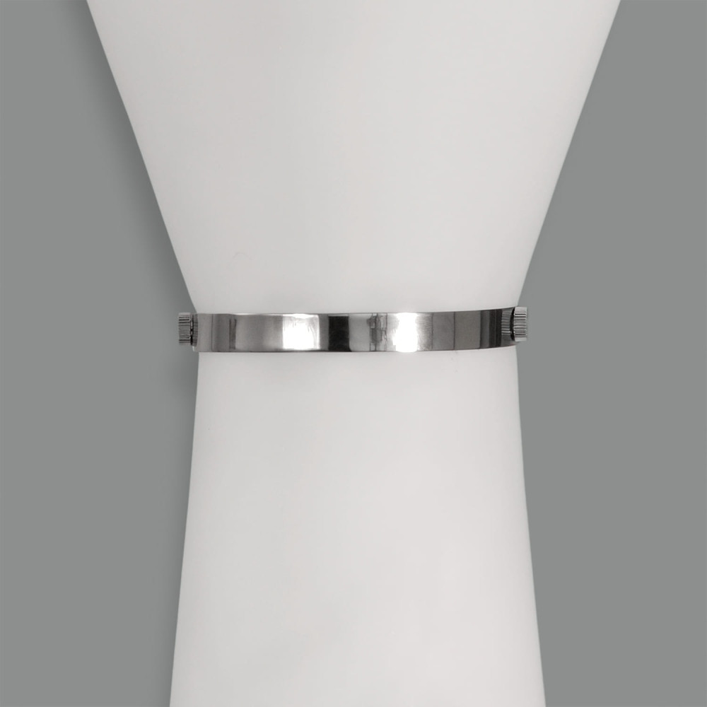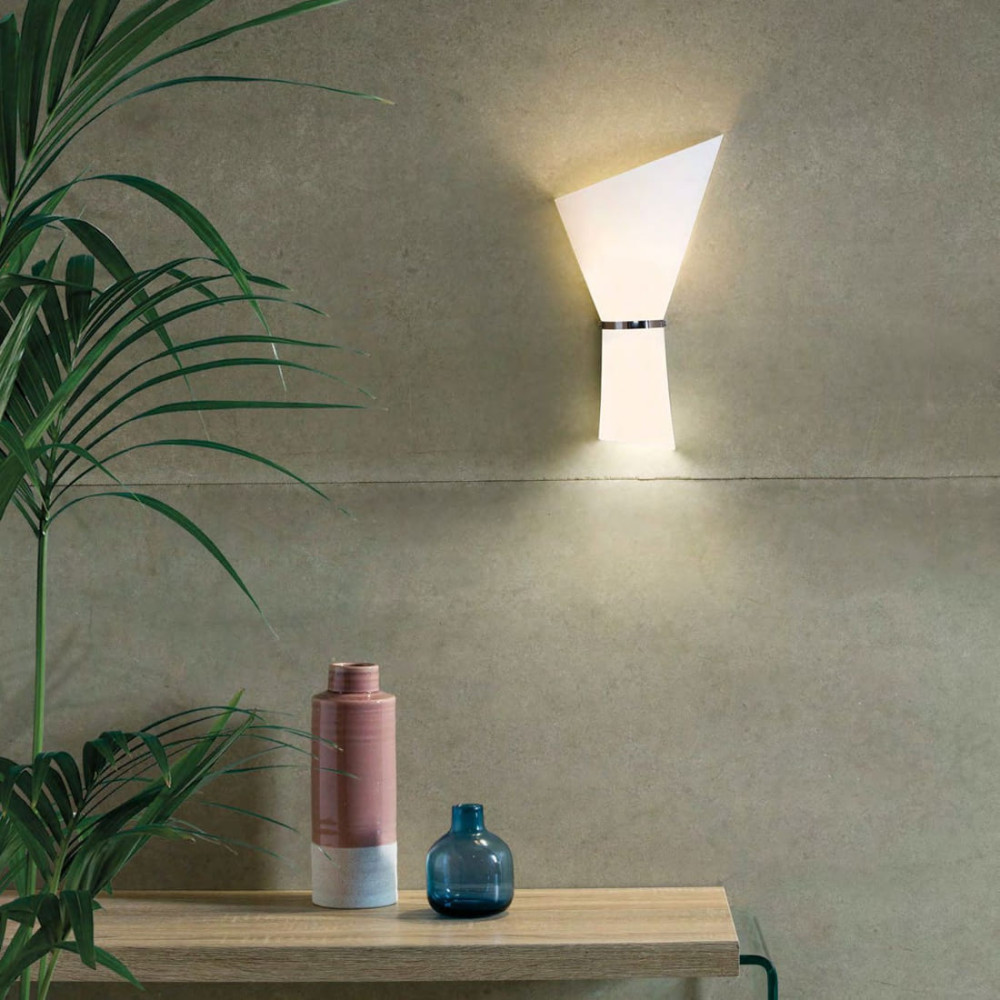 Aplique de pared fabricado con cristal doble capa opal y embellecedor metálico intercambiable en dos acabados: cromo y oro.