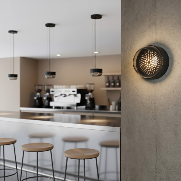 Aplique de pared o plafón de techo fabricado en cristal y aluminio acabado smoke fumé, disponible en versión aplique y colgante. Fuente de luz led de 10W 2700k 830lm.