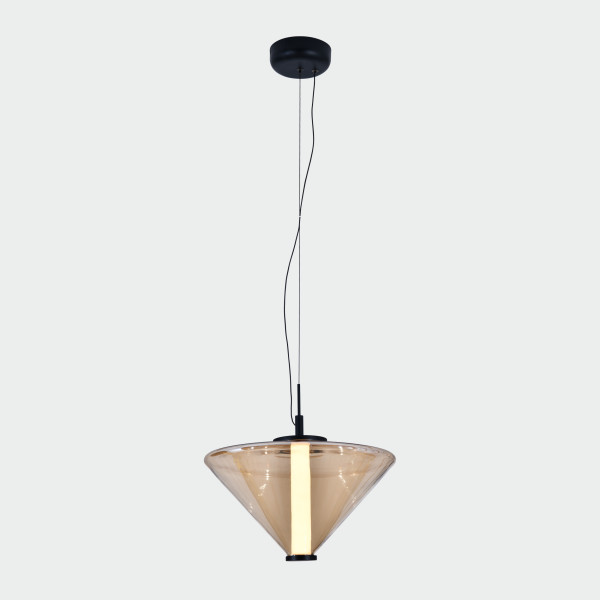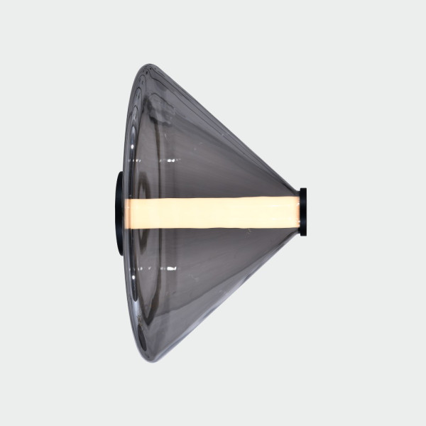 Aplique de pared o plafón de techo de doble tulipa fabricado en cristal y aluminio disponible en acabados ambar y smoke fumé, dos tamaños y versión aplique y colgante. Fuente de luz led de 14,5W 2700k 855lm.