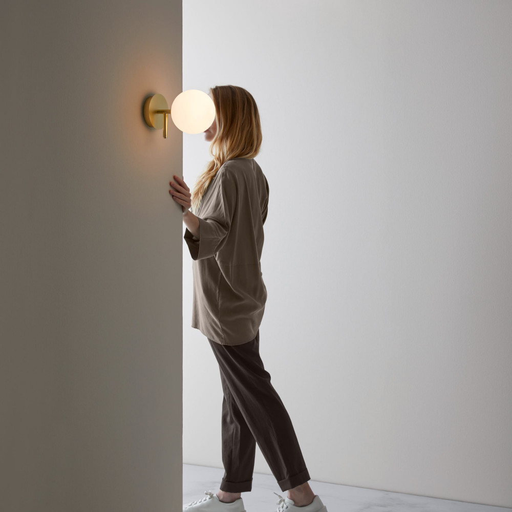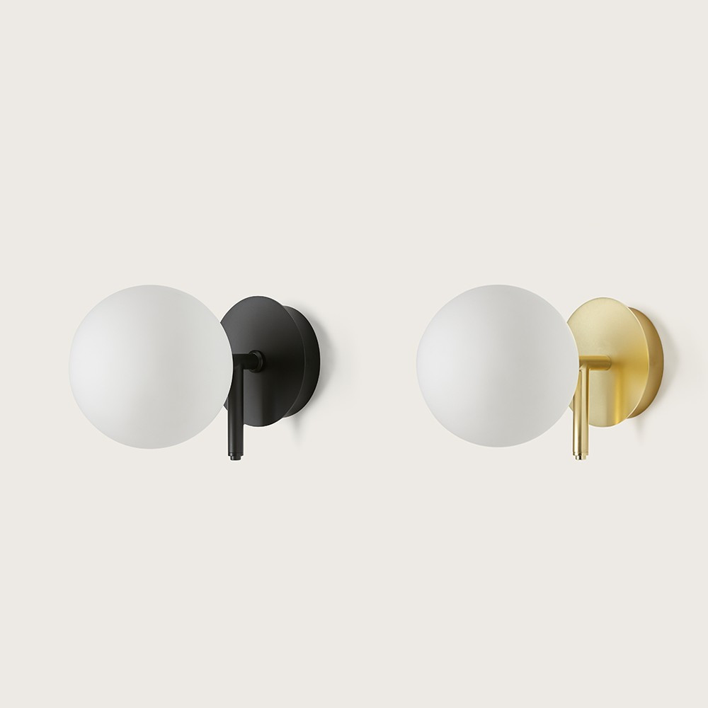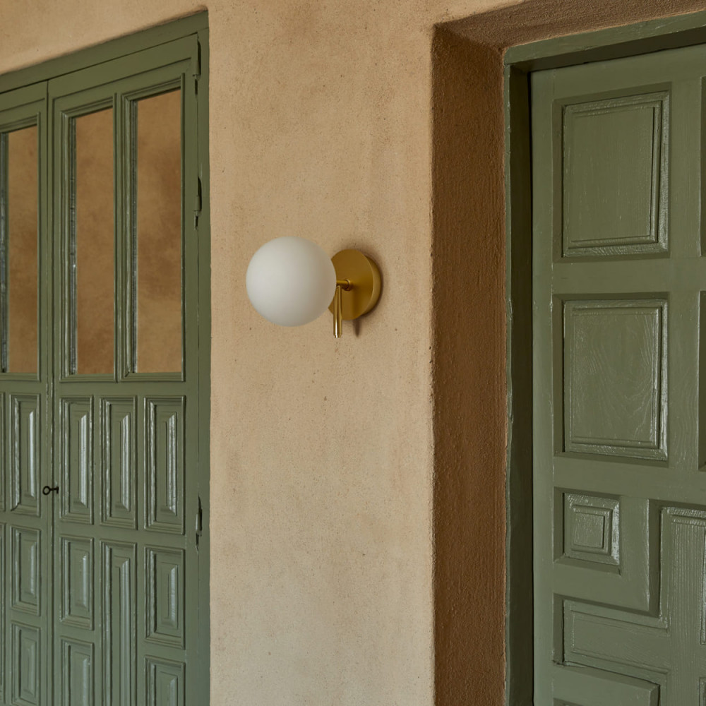Aplique de pared fabricado con una estructura de acero dorada y una tulipa de vidrio soplado opal. Su diseño lo hace ideal para cualquier estancia junto a luz cálida de ambiente que proporciona.