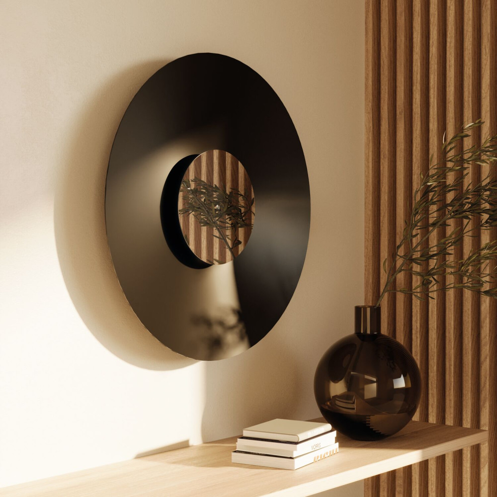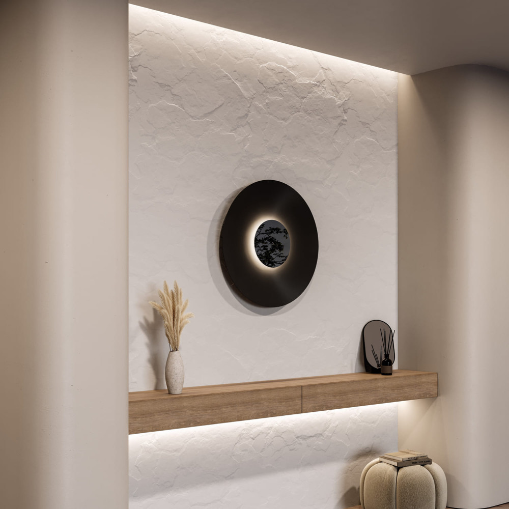 El aplique BigCoss presenta una cúpula de 80 cm de diámetro en un cautivador negro mate, que añade un toque de modernidad y sofisticación a cualquier pared. Complementando esta imponente presencia, el aplique cuenta con un difusor de cristal con acabado espejo, que agrega un brillo sutil y una dimensión adicional al diseño.