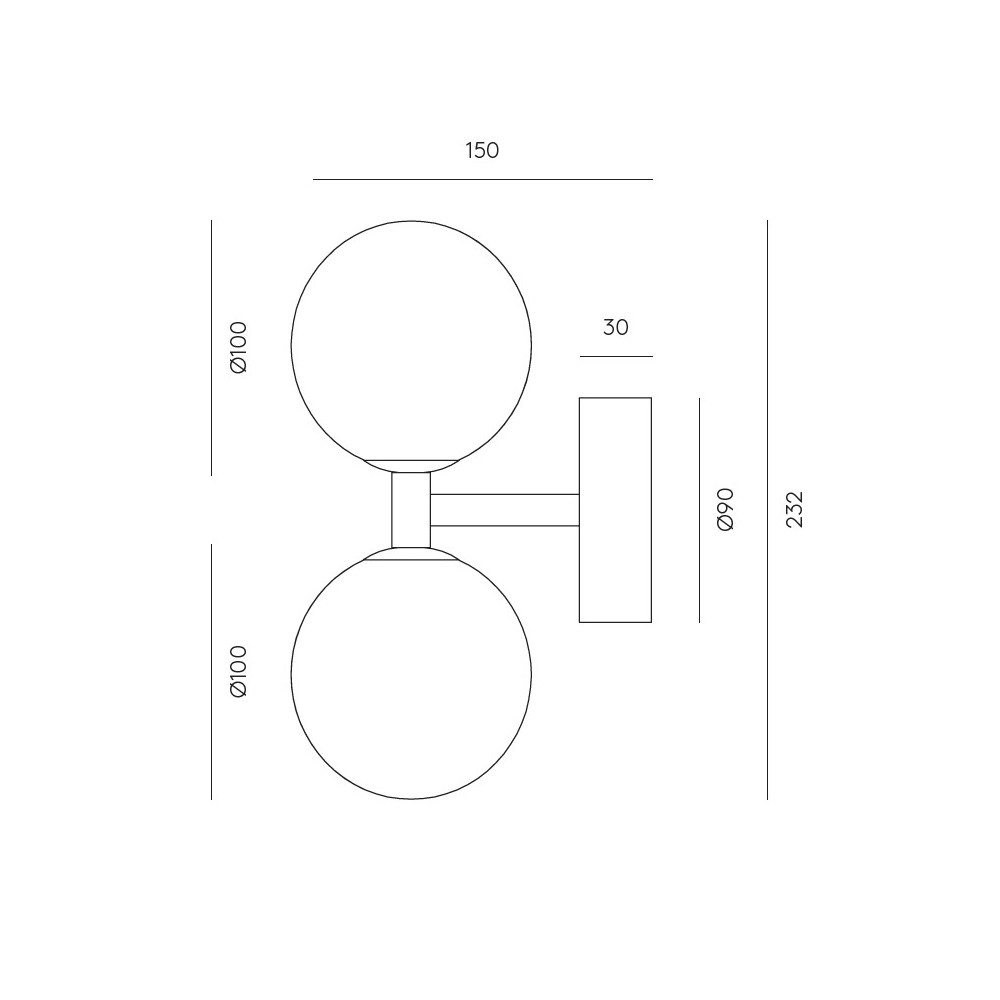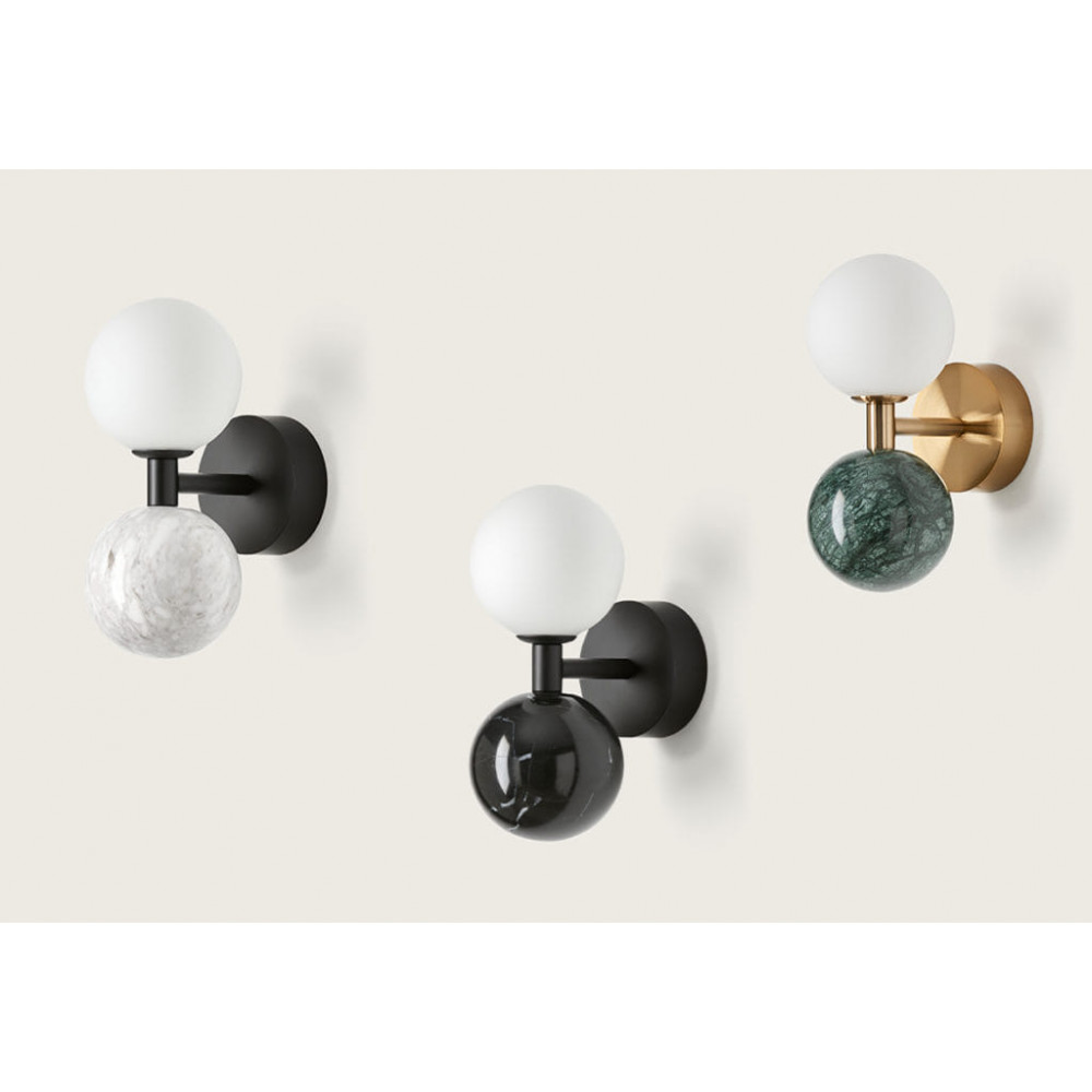 Aplique de pared diseñado por Pepe Fornas. La estructura de este aplique está realizada con acero de color negro mate o oro envejecido, la cual soporta dos bolas una de vidrio que esconde la fuente de luz y una de mármol en color blanco, verde o negro.
