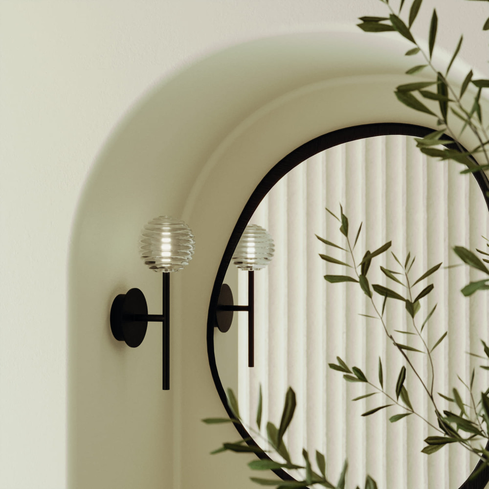 Aplique de pared parte de la colección Doul de Aromas, diseñada por Agus Gascón. Esta lámpara esta compuesta por un cuerpo metálico sencillo, minimalista y elegante unido a una tulipa de cristal rayado transparente.