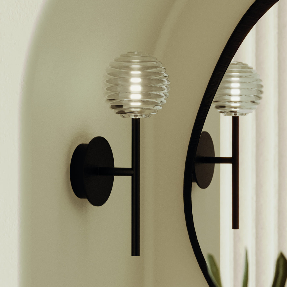 Aplique con cuerpo de acero acabado en negro con tulipa de cristal rayado.