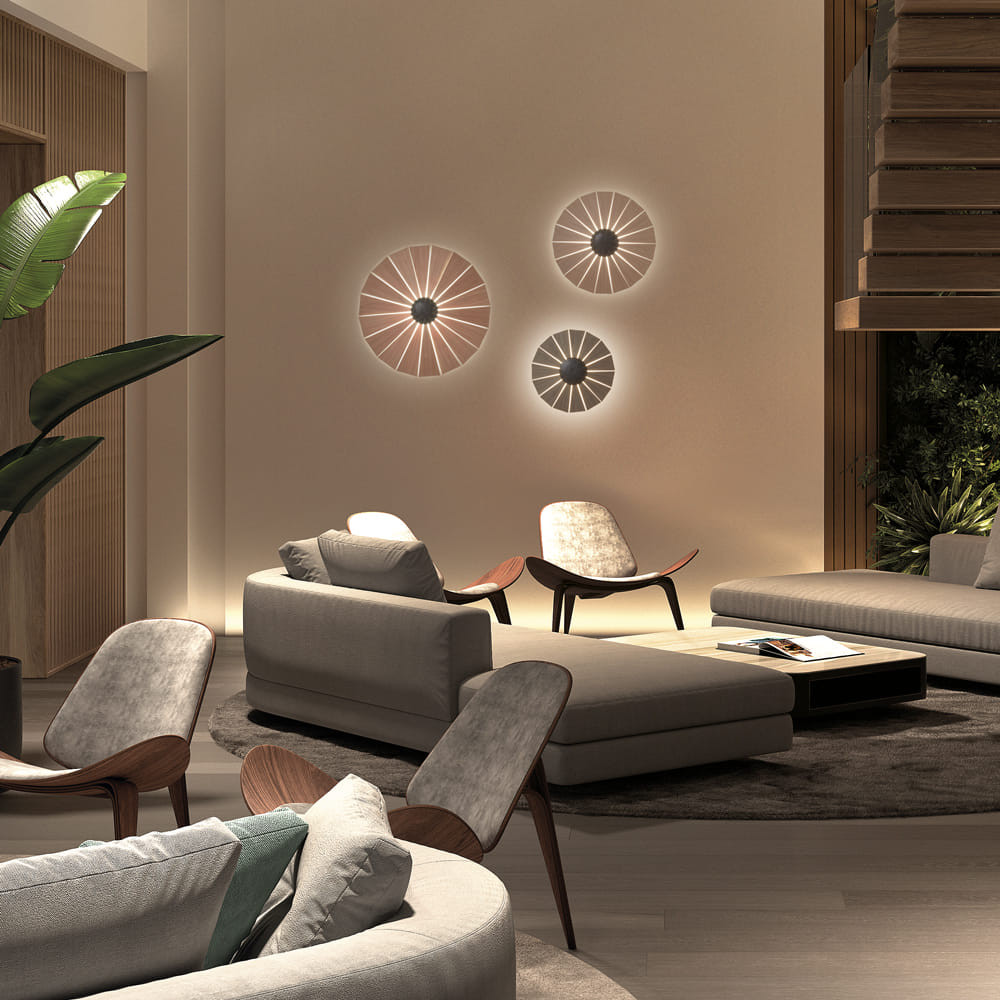 Exo Lighting presenta la familia de apliques de pared EYE. Están fabricados en madera y cuenta con tecnología LED SMD. Disponible en tres tamaños: S de 42cm de diámetro, M de 62cm y L de 82cm. Sus acabados: madera clara, madera oscura o madera natural. Ideales para crear un ambiente cálido y moderno en espacios interiores como salones, hoteles, residenciales, recepciones, etc.