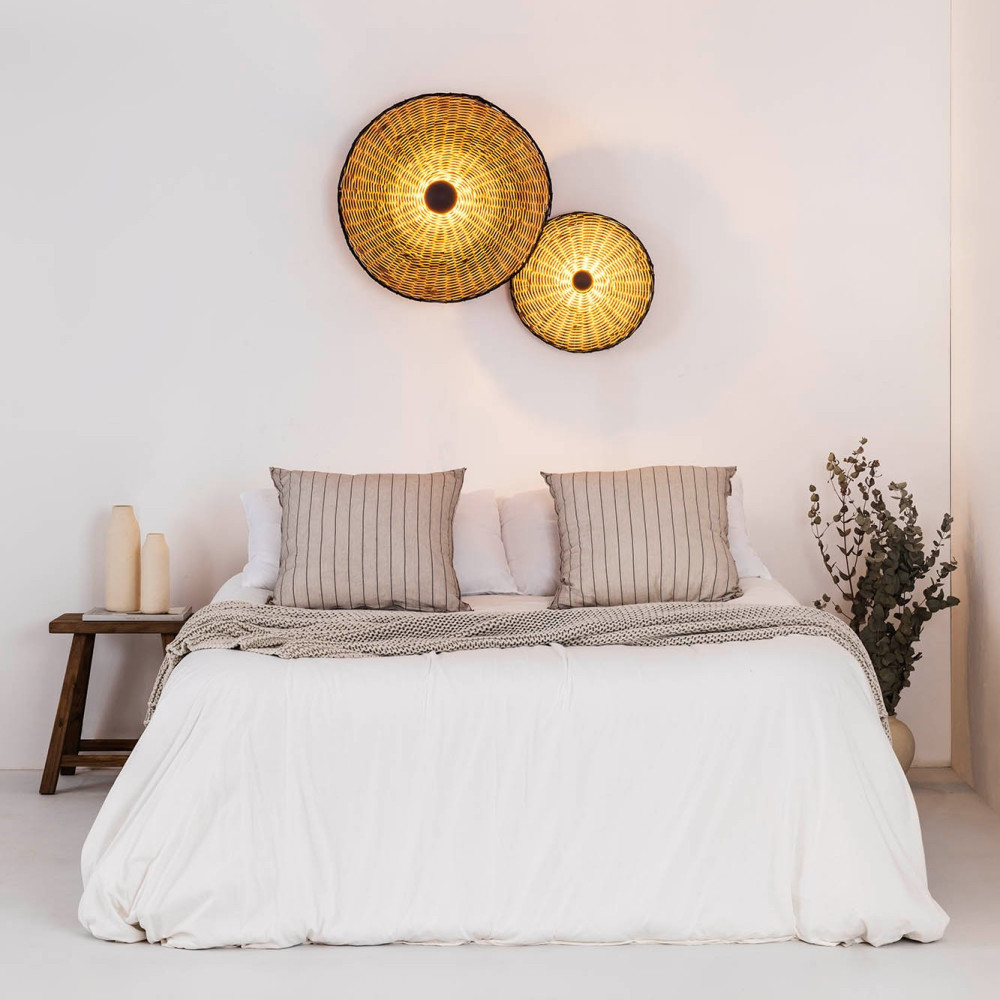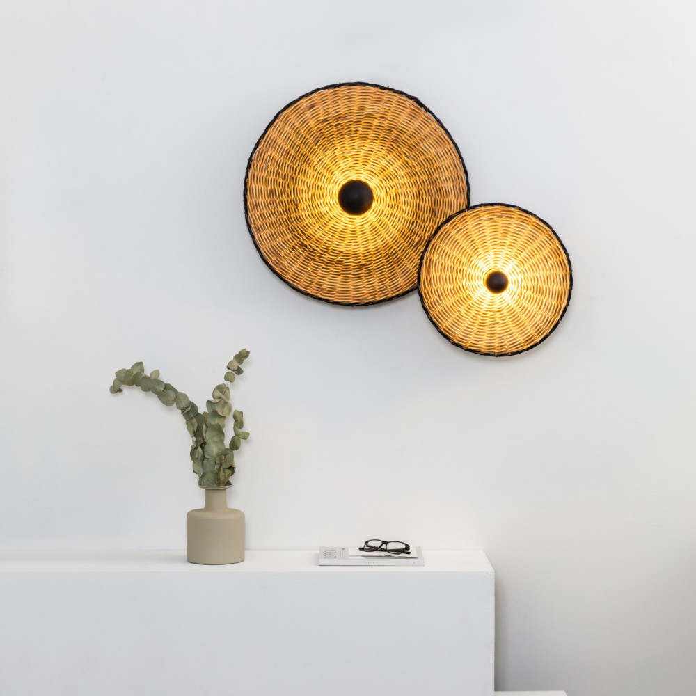 COSTAS es una colección de lámparas diseñada por Alex&Manel Lluscà que se caracteriza por las pantallas de ratán. Disponible en dos medidas, el diseño deja a la vista la bombilla, en una mezcla de estilo minimalista y mediterráneo. Está pensada para la iluminación interior de todo tipo de espacios, pero en especial para el sector contract. Esta es la versión con un diámetro de 40cm y 7cm de alto. COSTAS permite crear islas en el techo y en la pared.