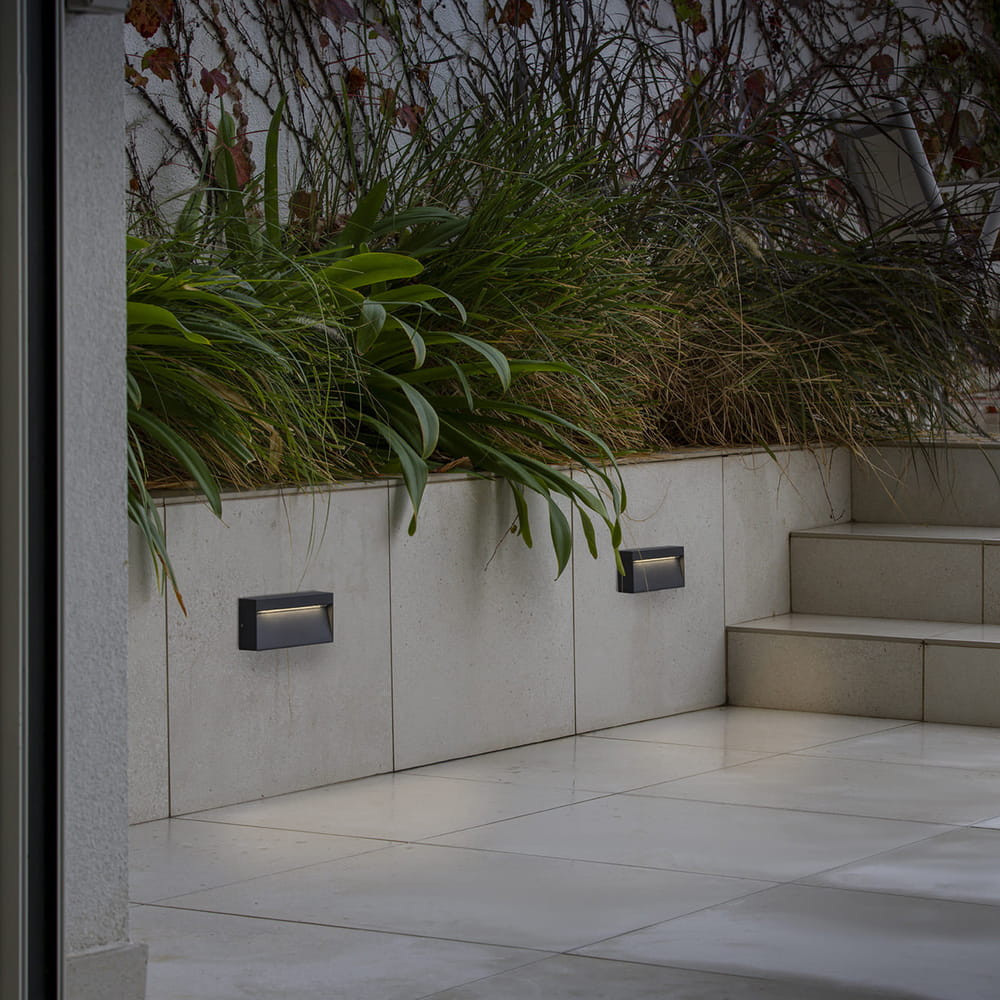 Aplique rectangular de exterior gris oscuro, permite elegir entre 4 temperaturas de color. 6W, IP65, 111/121/127/139lm