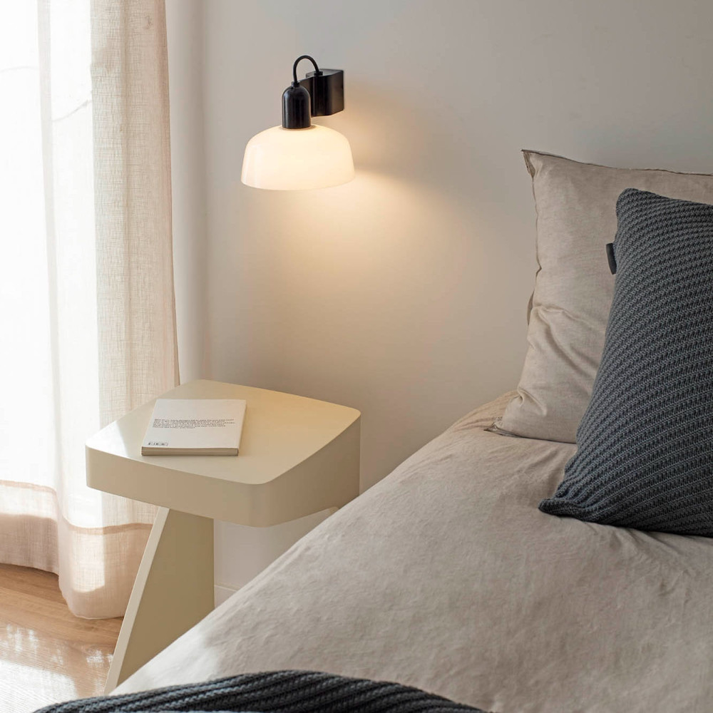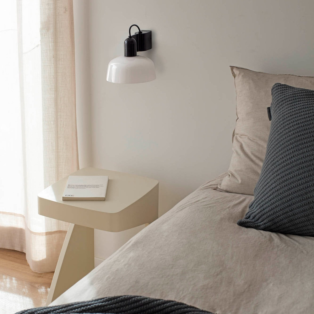 TATAWIN es una familia de luminarias diseñadas por Adolfo Abejón. La forma de la pantalla recuerda a la parte superior de las características viviendas de Tataouine, ciudad situada al sureste de Túnez. Este aplique compacto y elegante tiene el cuerpo de aluminio y la pantalla de cristal opal blanco.