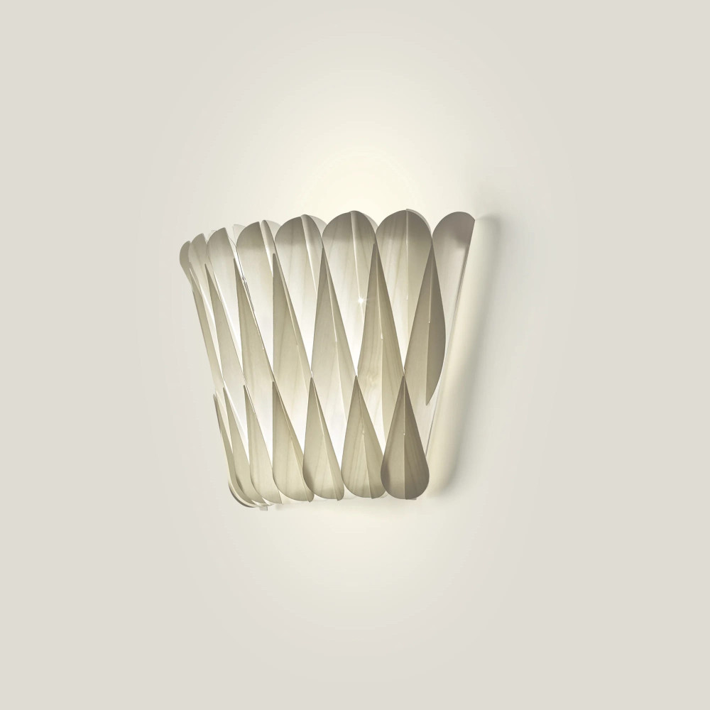 El patrón de texturas de la pantalla de chapa de madera tejida de Lola cobra vida en la lámpara de pared Lola. La luz de Lola aplique es seductoramente suave. Lola aplique está disponible en chapa de madera de haya natural o blanco marfil.