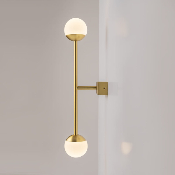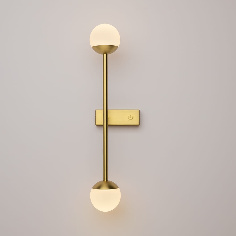 Aplique de pared LED latón satinado con dos esferas de cristal y control táctil. 10W, 800lm, 3000K