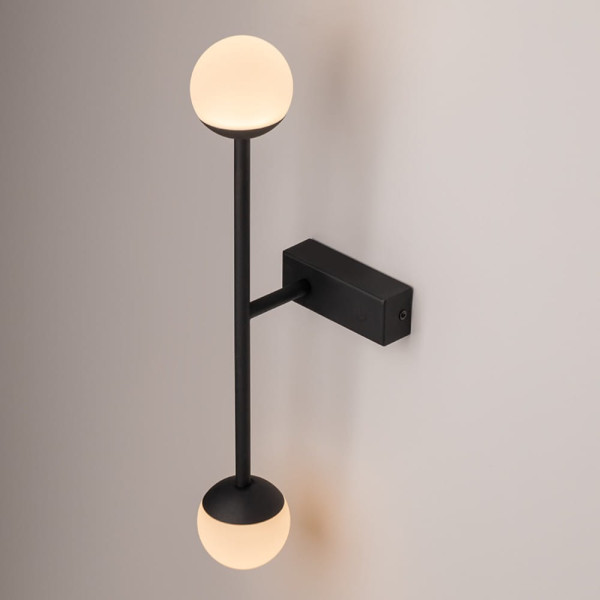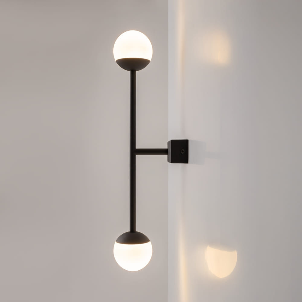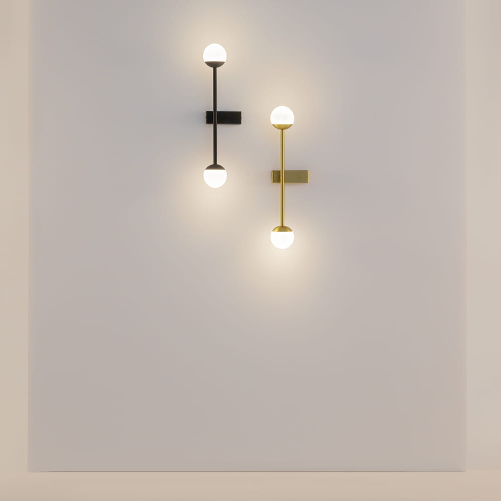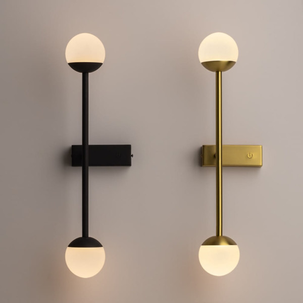 Aplique de pared LED latón satinado con dos esferas de cristal y control táctil. 10W, 800lm, 3000K