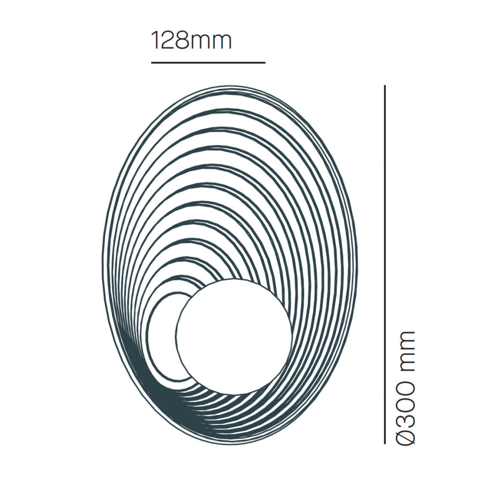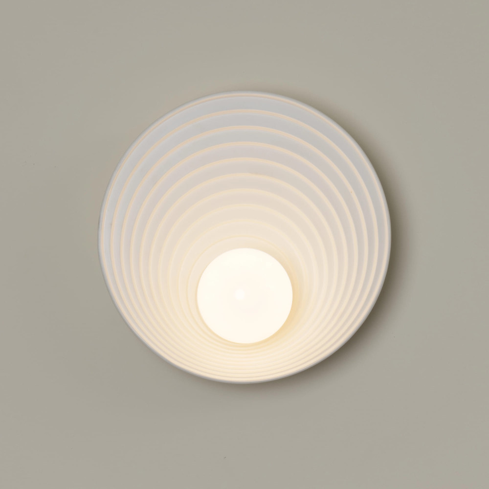 Pantalla difusora de 10 cm de diámetro, en vidrio soplado opal brillo. Soporte del vidrio que le une a la base en policarbonato inyectado, acabado en blanco. Fijación mediante sistema de roscado. Bases en cerámica con acabado en pintura acrílica. Sistema de fijación a pared mediante imanes de neodimio en la sotabase.