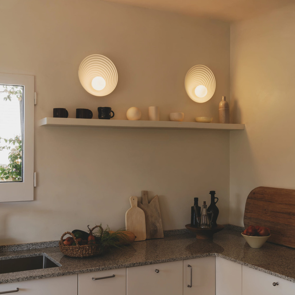 Albor ilumina cada espacio con la magia y serenidad del amanecer. Este aplique circular presenta una cautivadora pantalla difusora en vidrio soplado que, al brillar, evoca la salida del sol, ofreciendo un resplandor suave al entorno. Elaborada en cerámica mediante un proceso artesanal, esta pieza infunde singularidad en su diseño. Albor ilumina tu espacio brindando la sensación cálida de un nuevo día. Disponible en tres colores distintos, visón, terracota y gris marengo. Se fija a la pared mediante imanes de neodimio, lo que hace fácil su colocación.