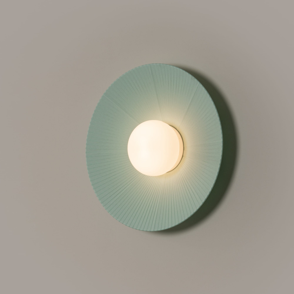 Aplique formado por una esfera de vidrio opal y pantalla verde turquesa.