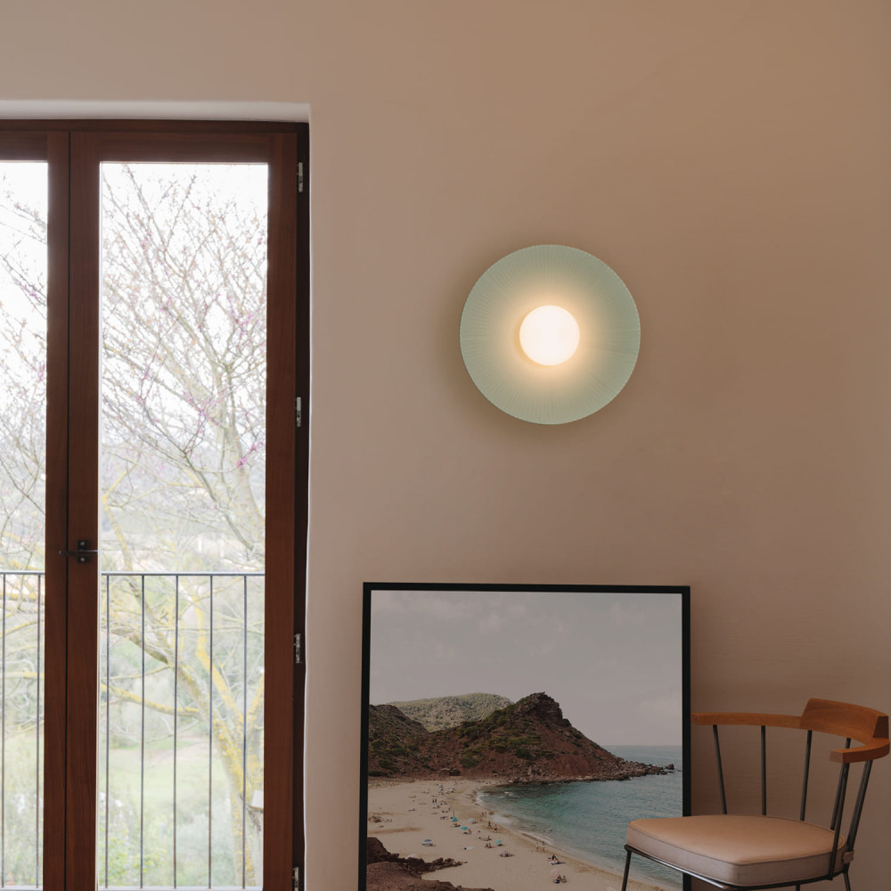 Es en los polos del planeta donde intercepta el eje de rotación de la Tierra con la esfera celeste. Guiado por este suceso, Arctic Circle se caracteriza por el uso de las cintas de tejido dispuestas radialmente, las cuales se van hilvanando para confluir en el centro y acoger a la tulipa por uno de sus polos. A pesar de ser una pieza sólida y firme, el juego de las cintas sobrepuestas una detrás de otra aportan ligereza a la lámpara, evocando a las capas y bloques de hielo que transcurren a lo largo de océano Ártico. La colección Arctic Circle tiene la facultad contradictoria de desprender aire fresco para crear un clima cálido. Como inspirados en una postal del polo norte, esta colección está disponible en verde turquesa y crema, además de tres tamaños combinables entre sí.