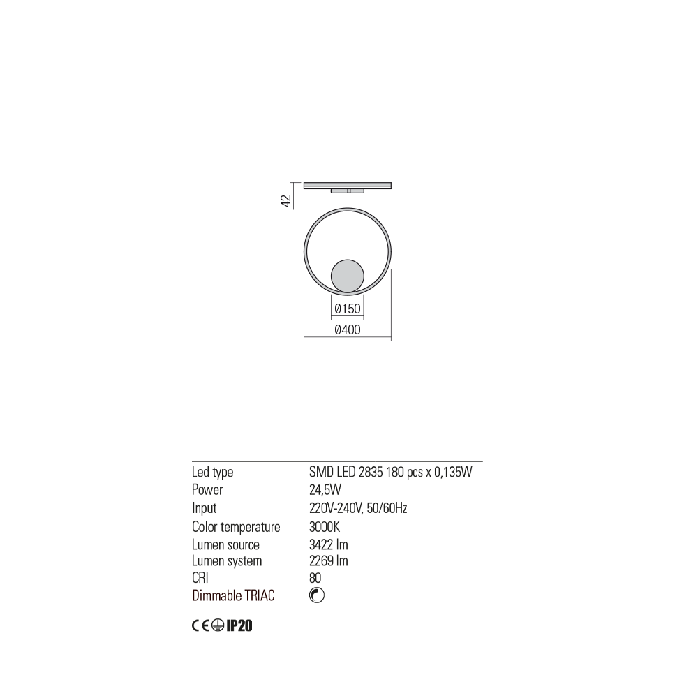 Aplique/plafón LED de Ø400 con luz indirecta regulable por TRIAC acabado en bronce.