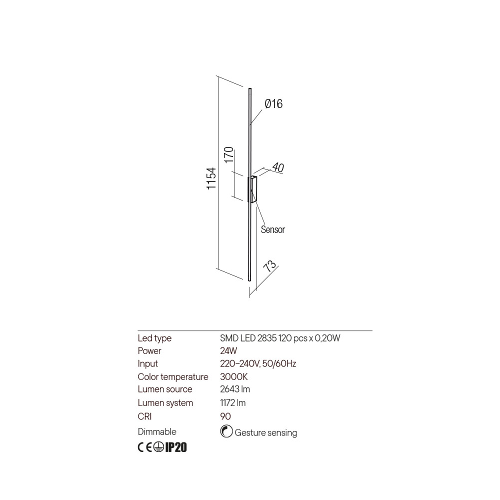 Aplique lineal negro mate de luz indirecta, LED 24W 1172lm 3000K dimmable con sensor IR.