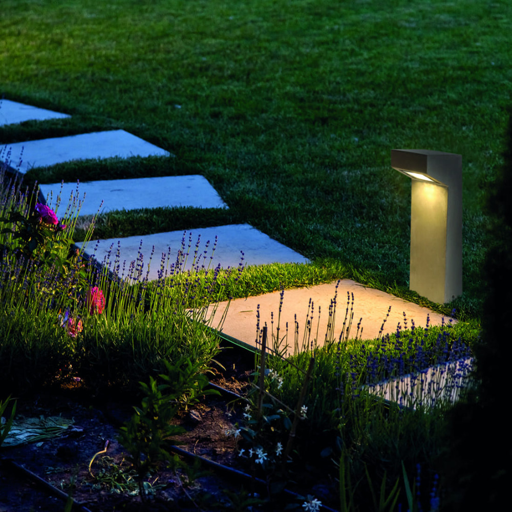Colección de lámparas fabricadas en cemento acabadas en gris. La colección está compuesta por un aplique de pared y una baliza para la iluminación de exteriores.