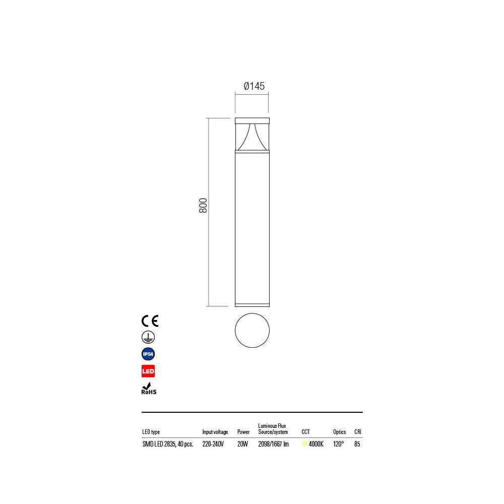Baliza LED para exteriores fabricada en aluminio acabada en gris oscuro. Funciona con LED integrado de 20W y color de luz cálida (3000K).