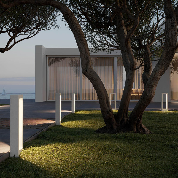 Balizas de exterior equipadas con LEDs SMD. Estructura de hormigón en acabado marfil, gris oscuro o terracota; disipador de calor LED en aluminio de grado marino 5083, componentes y tornillería en acero inoxidable AISI 316 y difusor de cristal transparente.