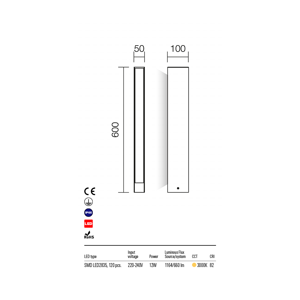 Baliza LED para exteriores fabricada en aluminio con haz de luz lateral. Funciona con LED integrado de 6W y color de luz cálida (3000K).