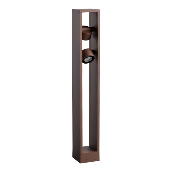 Balizas para exterior, equipadas con uno o dos mini proyectores orientables, con protección impermeable y antipolvo (IP65) y LED COB CREE. Cuerpo de aluminio inyectado con tratamiento anticorrosión y antioxidante por cataforesis, pintado electrostáticamente en gris oscuro, verde oscuro o corten. Sistema óptico con lente FRESNEL de PMMA y ángulo de apertura de 35°. Difusor de vidrio con borde serigrafiado en negro. Se suministra con conector estanco IP68.
