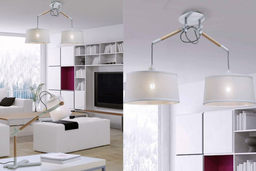 Por otro lado, se usan lámparas colgantes como luz general, y un ejemplo es la Lámpara de techo de 2 brazos de Mantra, fabricada en metal y madera con pantallas textiles blancas.