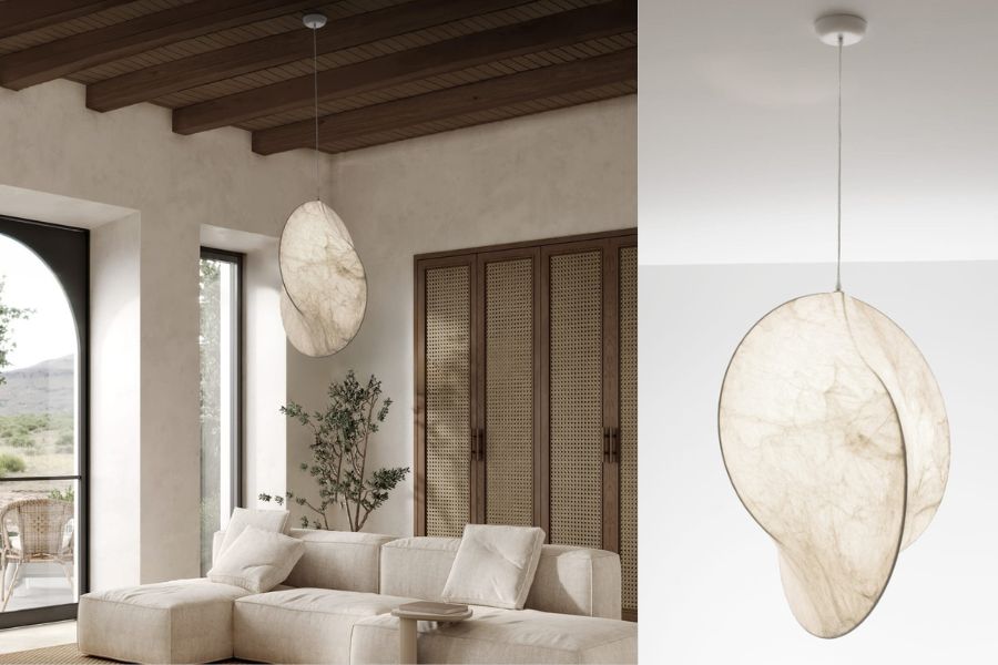 De igual manera, Esperia de Nova Luce es una lámpara colgante que destaca por su pantalla de diseño orgánico y elegante, fabricada con una combinación de seda de morera y acrílico. Su forma asimétrica con curvas suaves recuerda a dos esferas parcialmente superpuestas, creando un juego de luces y sombras que aporta una atmósfera cálida y natural.