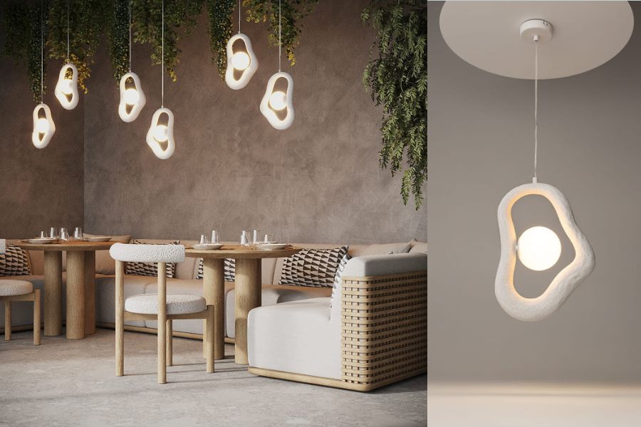 Un ejemplo es la lámpara Opus de Maytoni, una lámpara colgante disponible en blanco y gris, con una estructura liviana y una superficie táctil agradable.