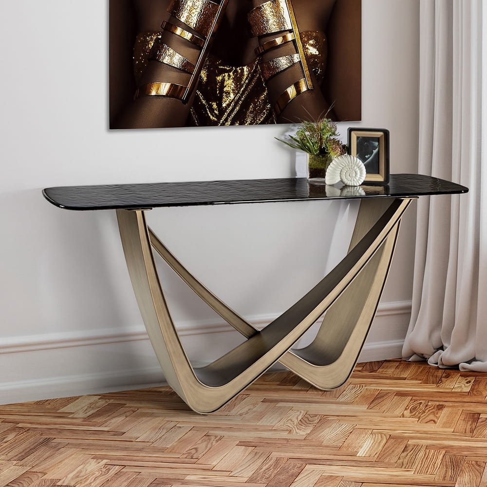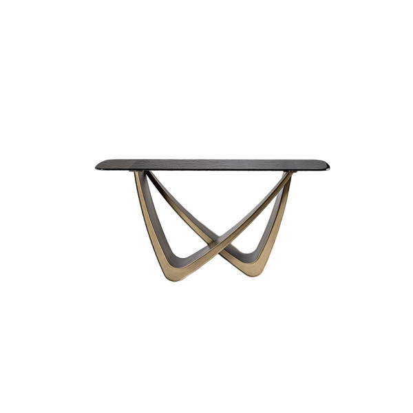 Mesa de comedor de 240cm, realizada en metal acabado bronce envejecido con tapa de cristal termo moldeado gris